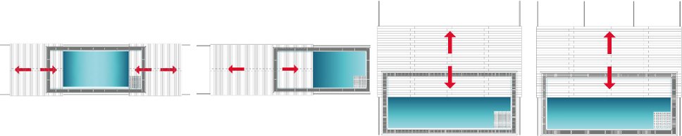 - Podélný posun - celý terasový modul se odsune na kratší stranu bazénu