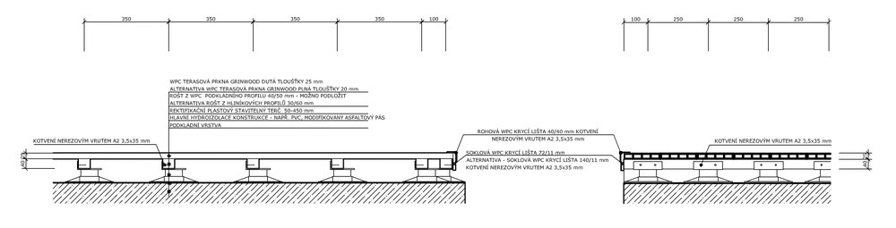 - konce terasových prken musí být vždy podloženy podkladním hranolem bez ohledu na dodržení roztečí 35cm
